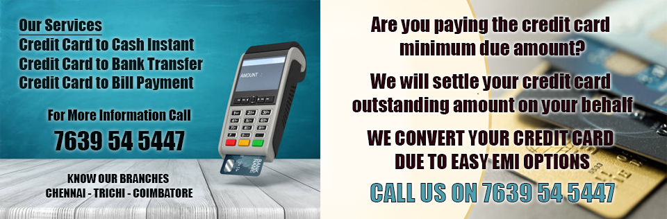 Credit Card to Cash in ChennaiIf you could not create an EMI at the time of purchase, you can still convert it into EMIs. When we talk about converting your credit card dues into EMIs, we offer this facility. Such EMI facility we offer for our customers or those who want to convert credit card due to EMIs. Call us @+91 7639545447. or Whats app us. This EMI is also included in your credit card statement every month and you will receive an amortisation schedule for the same.